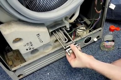 • Разборка стиральной машины. ТЕН находится под баком стиральной машины, чтобы добраться до него потребуется разборка. В простейшем случае, если нагревательный элемент вынимается сзади, мастеру понадобится просто открутить заднюю стенку стиральной машины, которая крепится на нескольких винтах. Такое расположение ТЭНа характерно для большинства стиральных машин производителей Indesit, Hotpoint-Ariston, Zanussi, LG, Candy, Ardo, Electrolux и т.д. Подольше повозиться с разборкой придётся, если нагреватель вынимается спереди. Мастеру потребуется снять верхнюю крышку стиралки и разобрать переднюю панель. Переднее расположение нагревательного элемента, чаще всего, встречается в стиралках марок Bosch и Samsung.